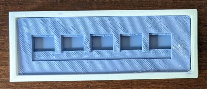 The next iteration was a two-part mold with an opening to pour plastic into and sprues to let air and excess plastic escape. The mold is kept an an angle so the air bubbles will rise toward the sprues. These types of plastic parts are often made with a pressure chamber to eliminate bubbles, but it wasn't necessary in this case since there were very few bubbles. The resulting parts were good quality and took dye sublimation well, although some of the rows were a little warped which I think is due to taking them out of the mold too soon.