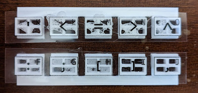 The design above is an SVG image generated by a Python script which is a strategy I have been using more and more recently since it's so convenient. Like with OpenSCAD, it's very powerful to be able to do the layout with code rather than a mouse. It was also easy to change the design around as necessary for further tests once the Python script was set up. Another thing that worked well was generating PNG files directly with the graphics.py Python library instead of SVG which was necessary for some of the later tests. Converting the SVG to PNG for printing turned out to be surprisingly difficult. Some text that was rendered correctly in Chrome would be the wrong size, misaligned or not render as a character when imported into Inkscape, GIMP, or conversion websites like ezgif.com. What worked best was a Chrome extension called SVG Export, although unfortunately it blends the edges of lines when exporting which isn't ideal when the image is laser cut for example. Another problem with using PVC cards is that the labels are not printed out at the exact right physical size even though the PNG file was accurate down to the pixel for the CR80 card size. The workers at the printing place explained that the image needed to be at an exact size in inches to come out correct, but doing it that way came out even less accurate. What worked in the end was squeezing all 40 labels onto a single card and having it printed out as a business card by VistaPrint which only charged about $40 for 50 cards.